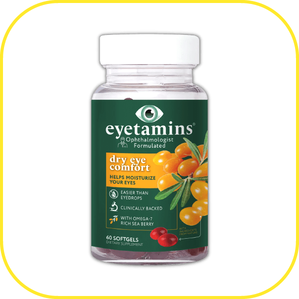 Eyetamins Dry Eye Comfort, eye vitamins are easier than eye drops and clinically proven to moisturize your eyes and skin from the inside out with omega-7 rich sea berry